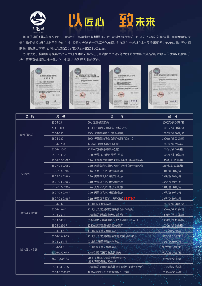 三色川(蘇州)科(kē)技(jì )有(yǒu)限公(gōng)司是一家定位于高端生物(wù)耗材模具(jù)研發、定制型耗材生産(chǎn)、以及分(fēn)子診斷、細胞培養、細胞免疫治療等生物(wù)相關領域耗材制品供應的企業。公(gōng)司有(yǒu)先進的十萬級淨化車(chē)間,全自動生産(chǎn)線(xiàn)。耗材産(chǎn)品均采用(yòng)無DNA/RNA酶、無熱源的醫(yī)用(yòng)級進口材質(zhì)。公(gōng)司已通過ISO 13485認證和ISO 9001認證。